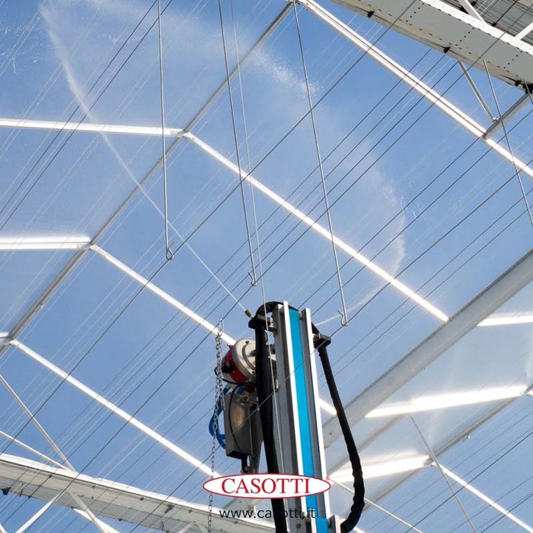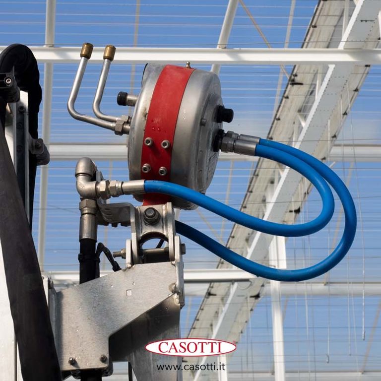 12V elektrisch apparaat met oscillerende jets voor toepassing op systemen voor het reinigen en desinfecteren van kassen. Dankzij de beweging van de jets wordt het glasoppervlak gelijkmatig bevochtigd, zelfs in de aanwezigheid van buizen of obstakels.