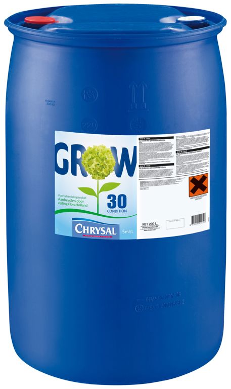 Chrysal Grow 30 is een nieuwe generatie voorbehandelingsmiddel dat bloemen conditioneert. Grow 30 is met name geschikt voor roos en Syringa. Chrysal Grow producten hebben een verbeterde werking en zijn aluminiumsulfaatvrij. Voor verschillende bloemsoorten geldt een verplichting bij aanlevering op de veiling.
