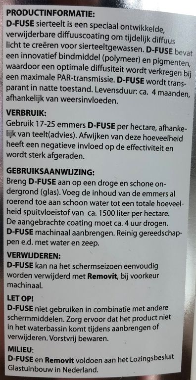 D-Fuse Extra is een weerbestendige diffuus coating die maximaal diffuus licht en optimale groeilicht transmissie (PAR) biedt. D-Fuse Extra bevat speciaal ontwikkelde pigmenten die het licht maximaal diffuseren en optimaal het groeilicht (PAR) doorlaten.