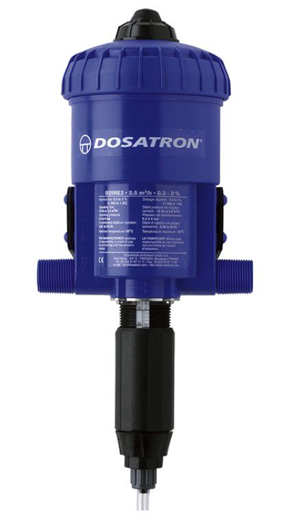 Wateraangedreven doseerpomp die automatisch en proportioneel een te doseren vloeistof aanzuigt in de waterstroom. De waterstroming drijft de pomp aan (geen stroom nodig). De Dosatron zuigt een ingesteld percentage concentraat aan, dat wordt gemengd met het water dat erdoorheen stroomt.