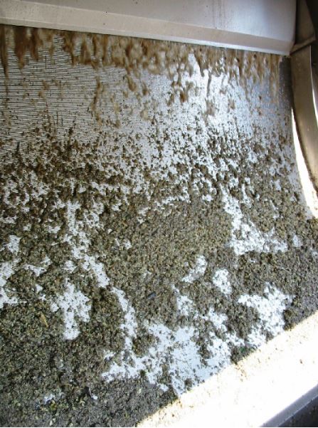 De gereinigde vloeistof verdwijnt achter de zeefplaat in de binnenbak, waarna het via de afvoeraansluiting wegstroomt. De afgescheiden vaste delen schuiven continu over de zeefplaat, waardoor zij uitlekken, inklinken en uiteindelijk naar beneden vallen.