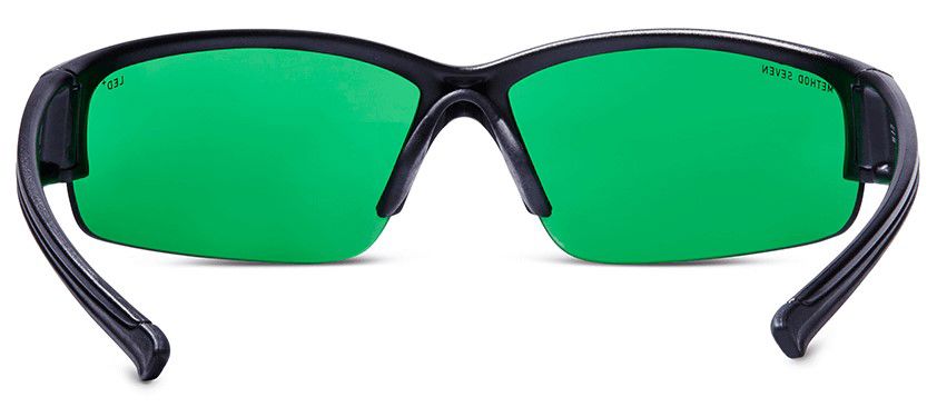 Bril tegen blootstelling aan LED-kweekverlichting (blauw, paars). Zwart montuur alleen aan bovenzijde en groene glazen.