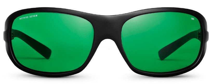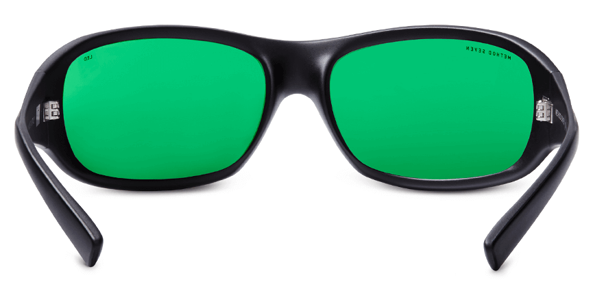 Bril tegen blootstelling aan LED-kweekverlichting (blauw, paars). Zwart, heel montuur rondom en groene glazen.