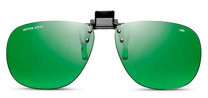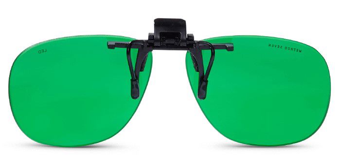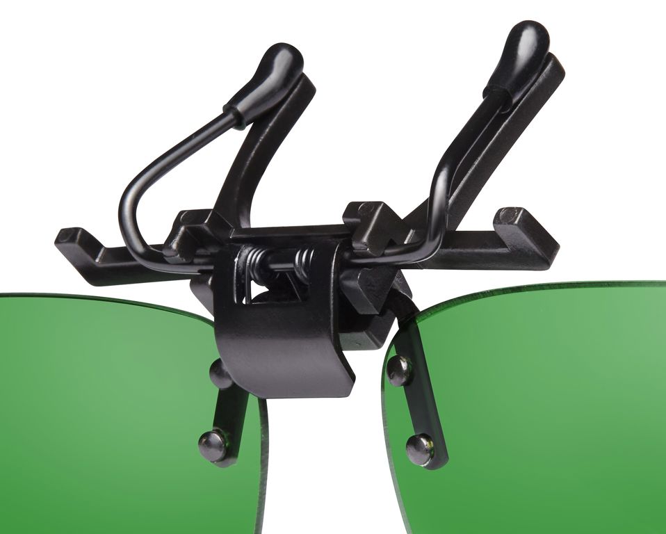 Clip-on-brilglazen tegen blootstelling aan LED-kweekverlichting (blauw, paars). Geen montuur/pootjes, groene glazen met Clip-on, speciaal voor brildragers.
