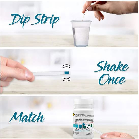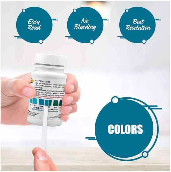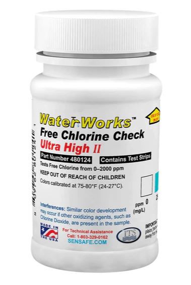 Deze eenvoudige kleurteststrip, van ons WaterWorks™ merk, stelt u in staat om snel en nauwkeurig het vrije chloor in water te testen, met een ultrahoge detectiebereik. Het is een eenvoudige dip- en lees teststrip met een nauwkeurige kleurenschaal op de achterkant van de fles en de resultaten worden binnen 60 seconden weergegeven.
