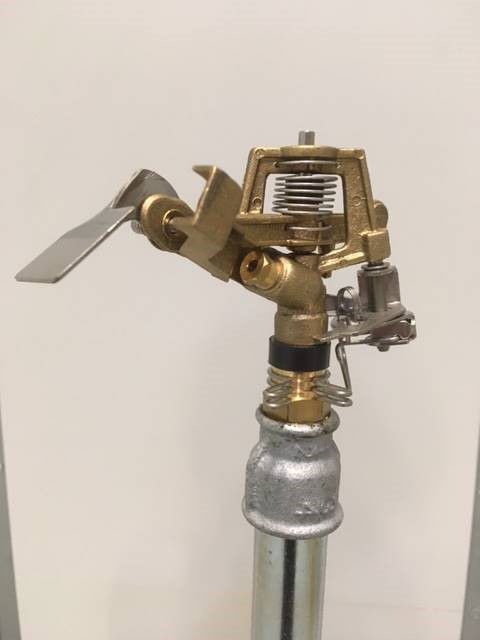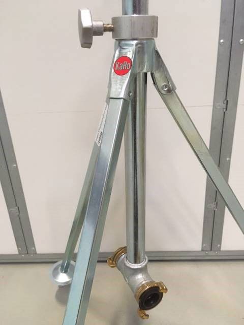 De driepoot is uitgerust met een sectorsproeier 423/WP ½ 4,0mm. Deze sectorsproeier kan sproeien in een hoek van 5 tot 360 graden. Door middel van het spatplaatje is de afstand van de waterstraal ook in te stellen. De sproeier sproeit maximaal 930 liter per uur en maximaal 13 meter ver.